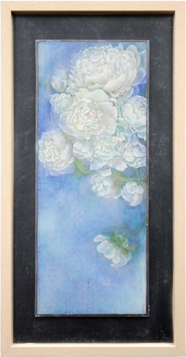 柔らかな白のグラデーションで描かれた花々が、淡い青の背景に映え、清らかで優美な雰囲気です。 技 法: 日本画 制作年: 2018年 サイズ: 40×16cm 材料等: 顔彩・岩絵の具