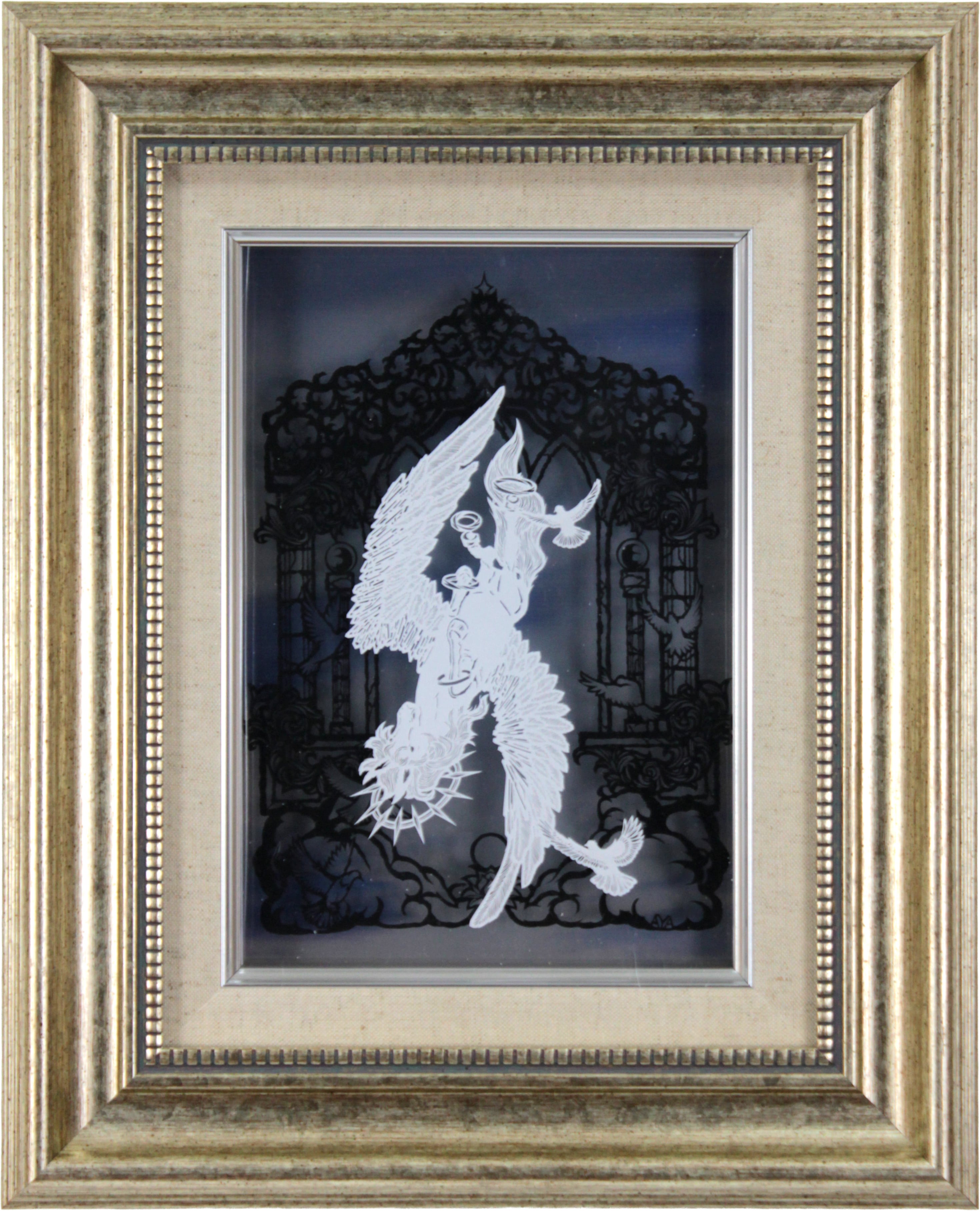 羽ばたく天使の躍動感と、背景の繊細な装飾が見事に調和しています。静謐な美しさを感じる作品です。