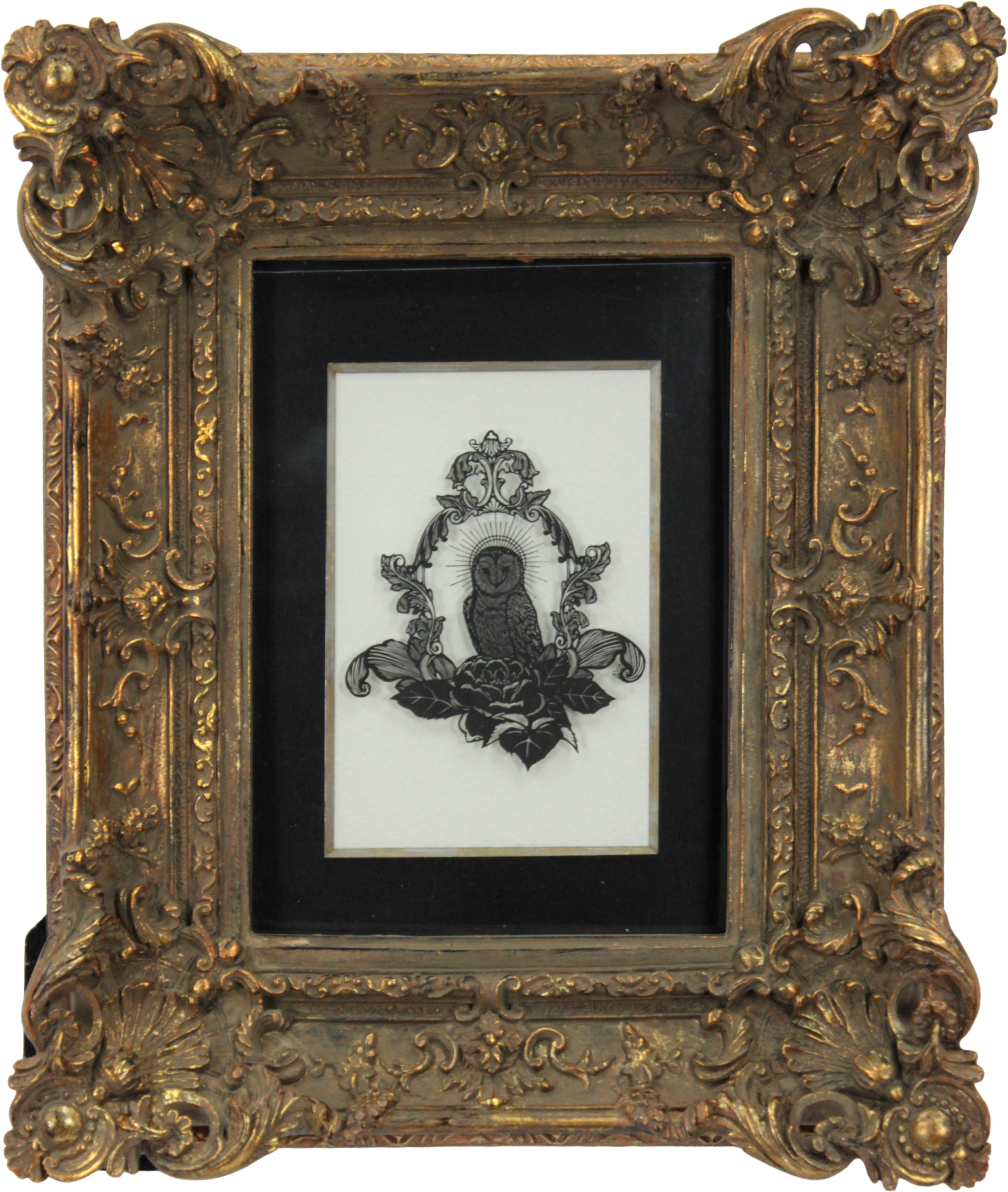 フクロウの神秘的な表情と、周囲の緻密な文様が荘厳な雰囲気を醸し出しています。額装も豪華で魅力的です。