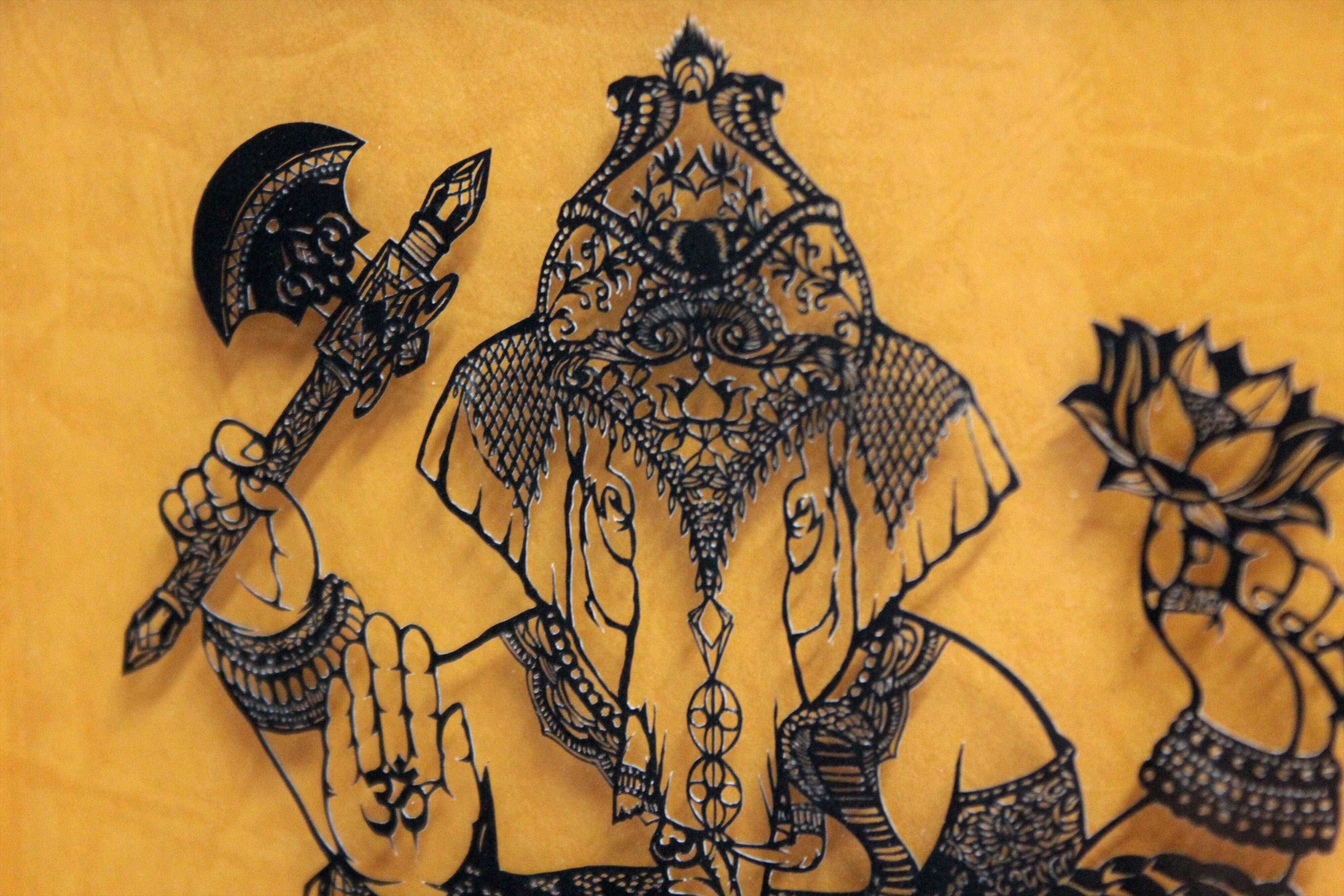 躍動感のある細かな線で表現されたガネーシャ神が、温かい背景色と相まって生命力を感じさせます。