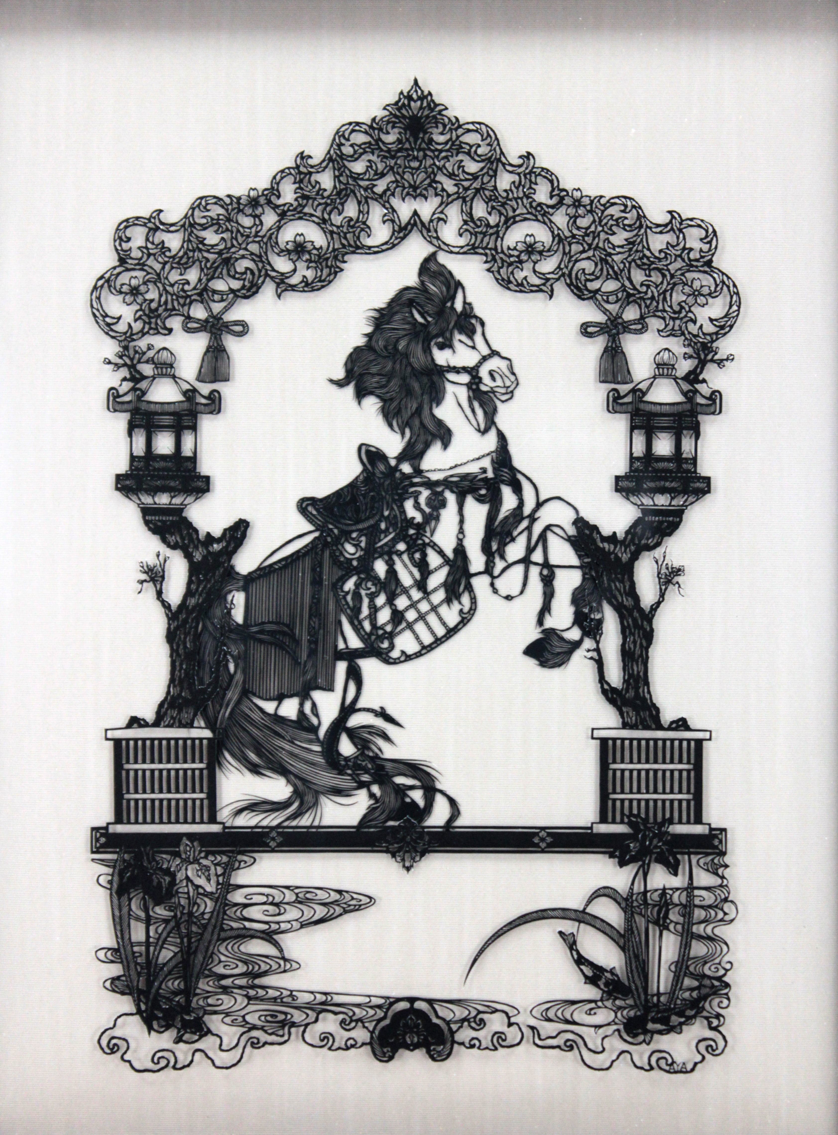宙を舞う馬の力強い躍動感と、背景の東洋的な細密な装飾が、見事なコントラストを生んでいます。
