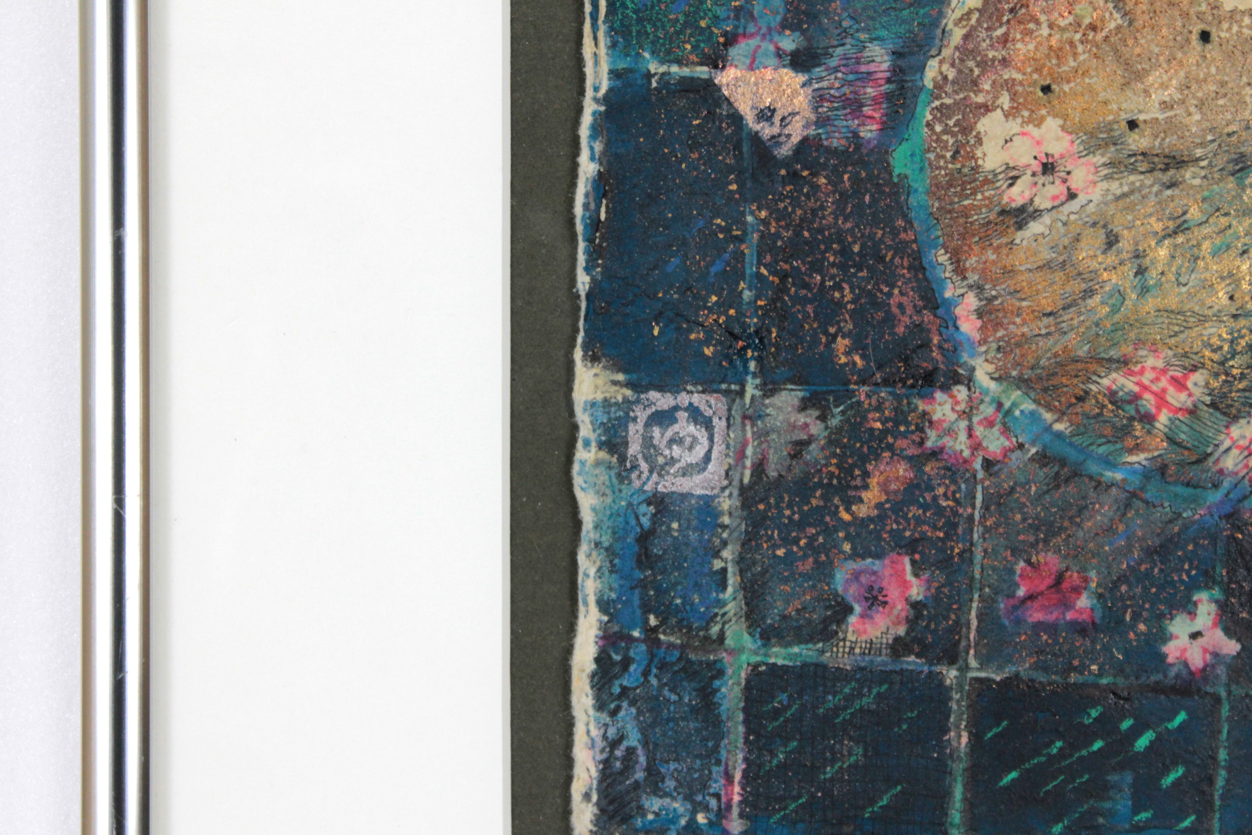 深い青のマチエールと円形の光の対比が神秘的で、時を経たような奥深い美しさを感じさせます。