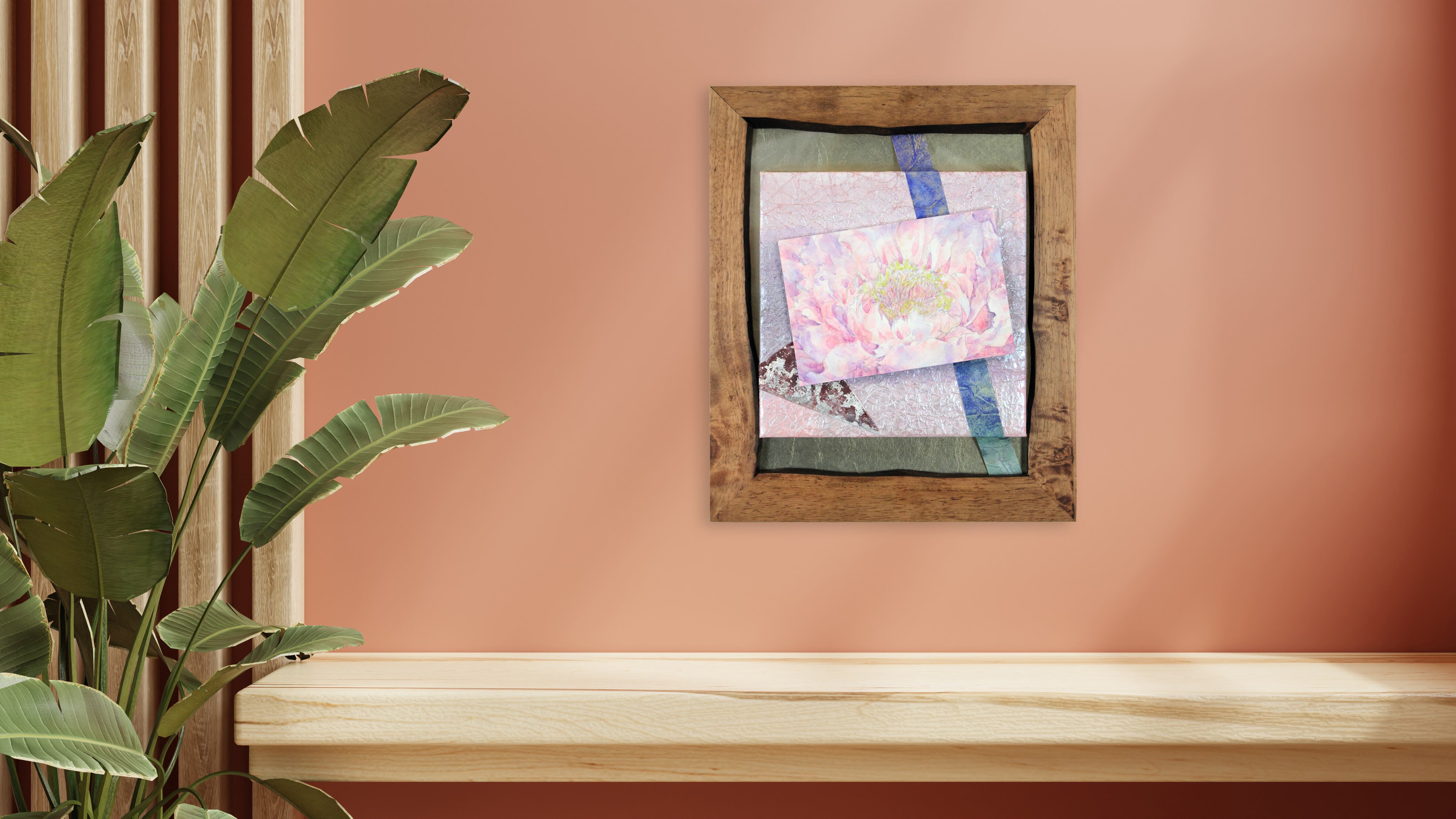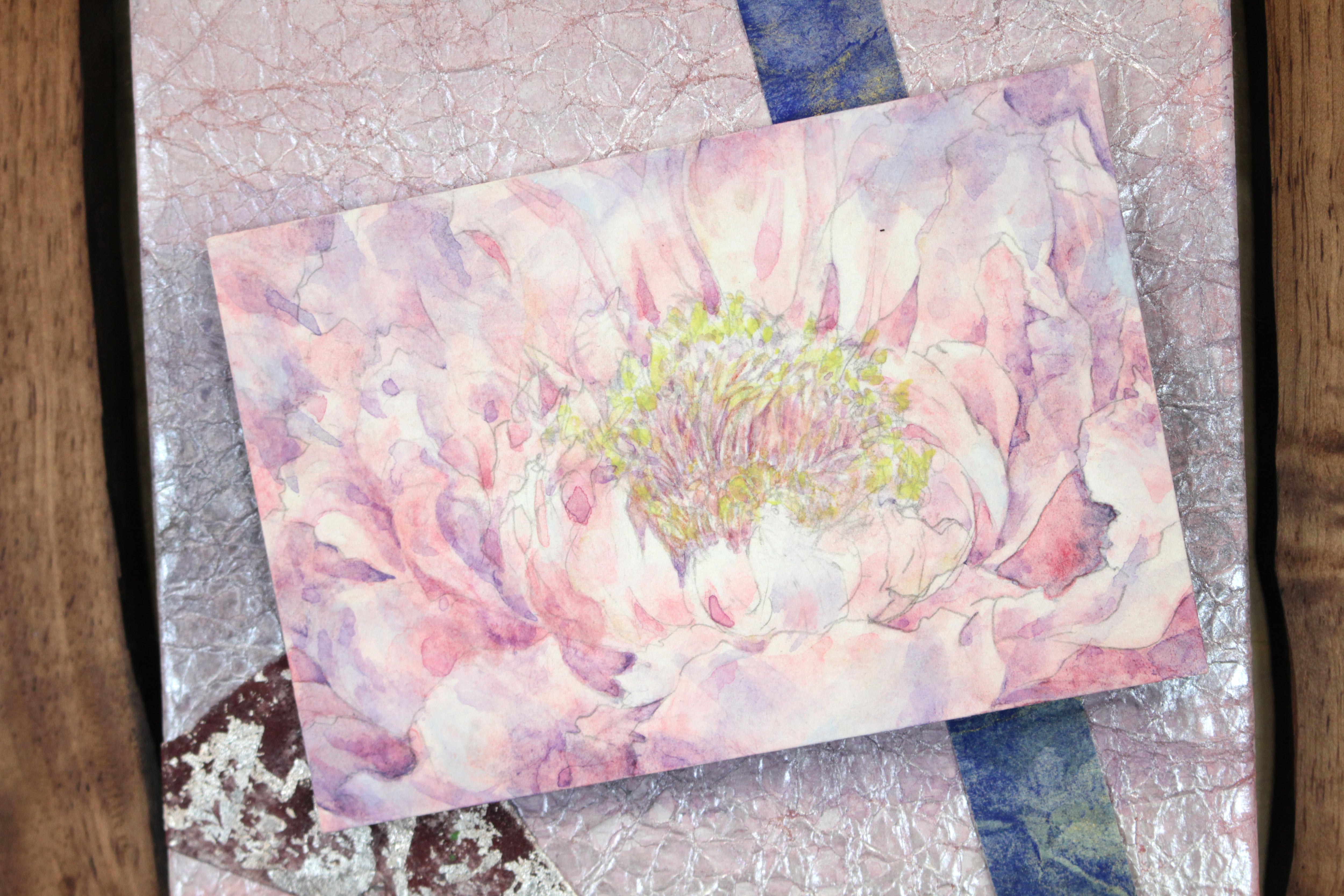 レアなデザインの額に合わせ、日本画と和紙をコラージュ。基底材にガラスとS0サイズの木製パネル、ハガキボードを使用。富貴花(ふうきか)は牡丹の別称。揉み紙技法を使用。