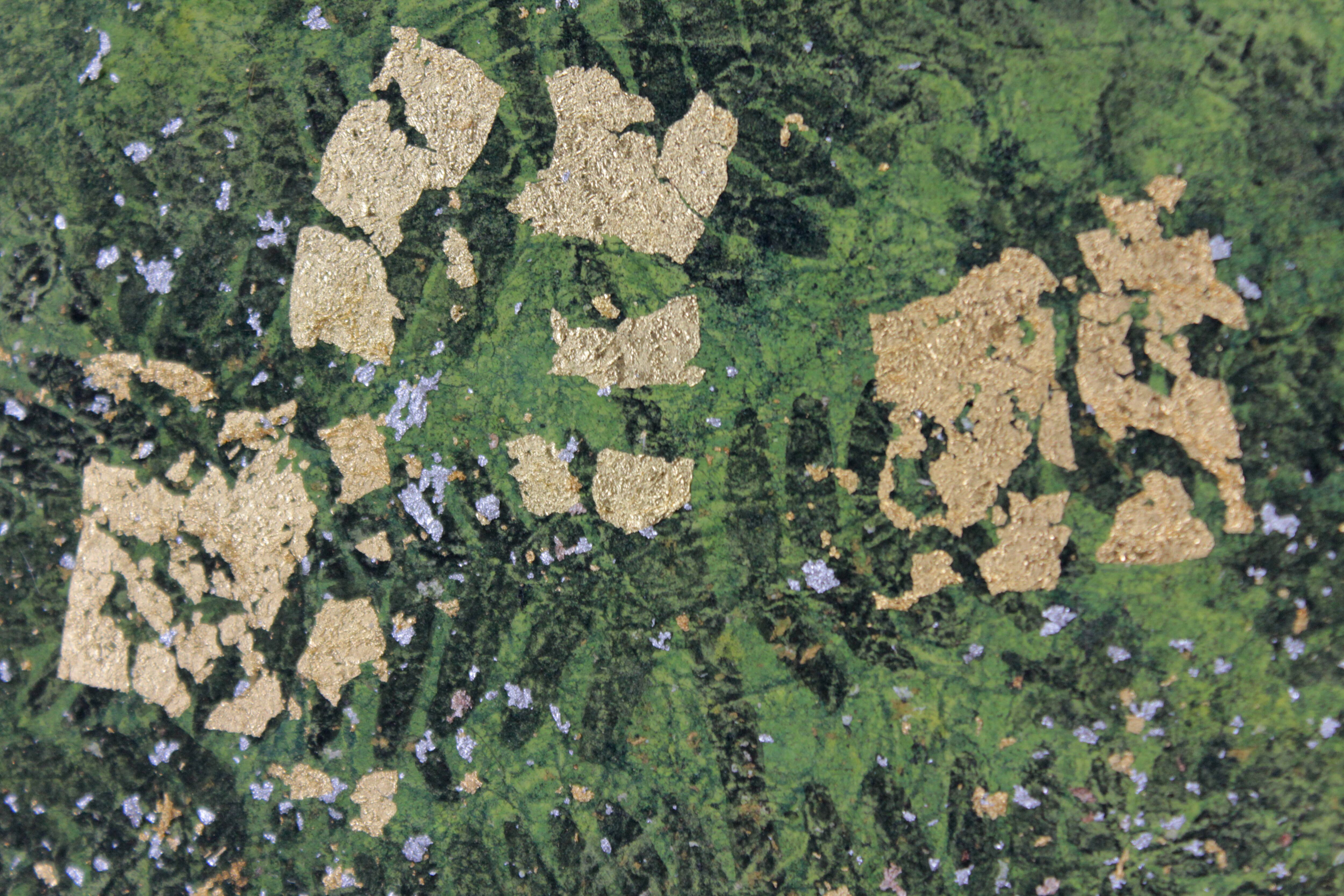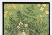 若草色の地にシダ植物が力強く描かれ、金箔が加わることで生命の輝きと躍動感を表現しています。