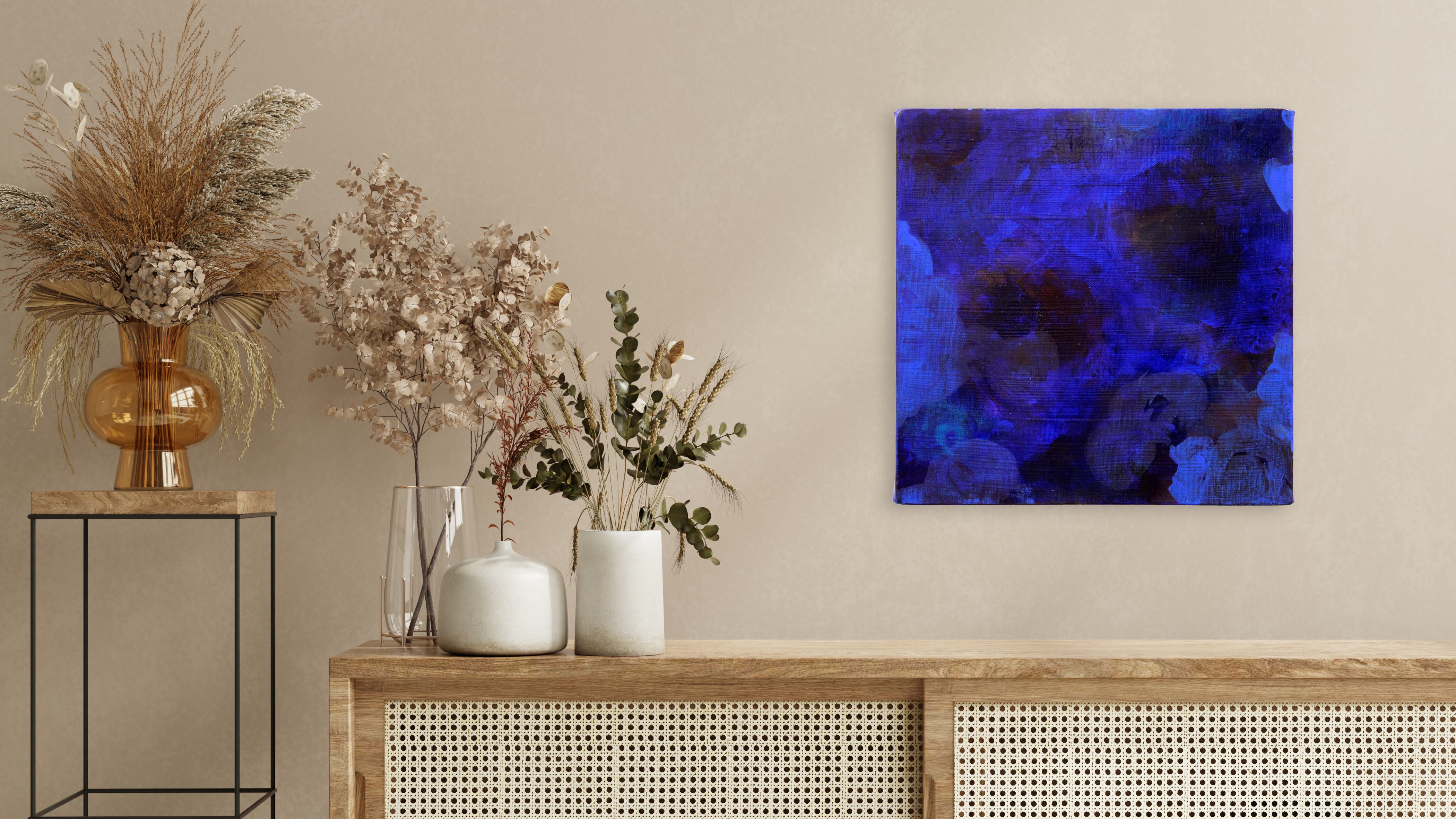 深く濃密な青色が画面全体を覆い、光と影の複雑な表現から無限の奥行きと静かな情熱を感じます。